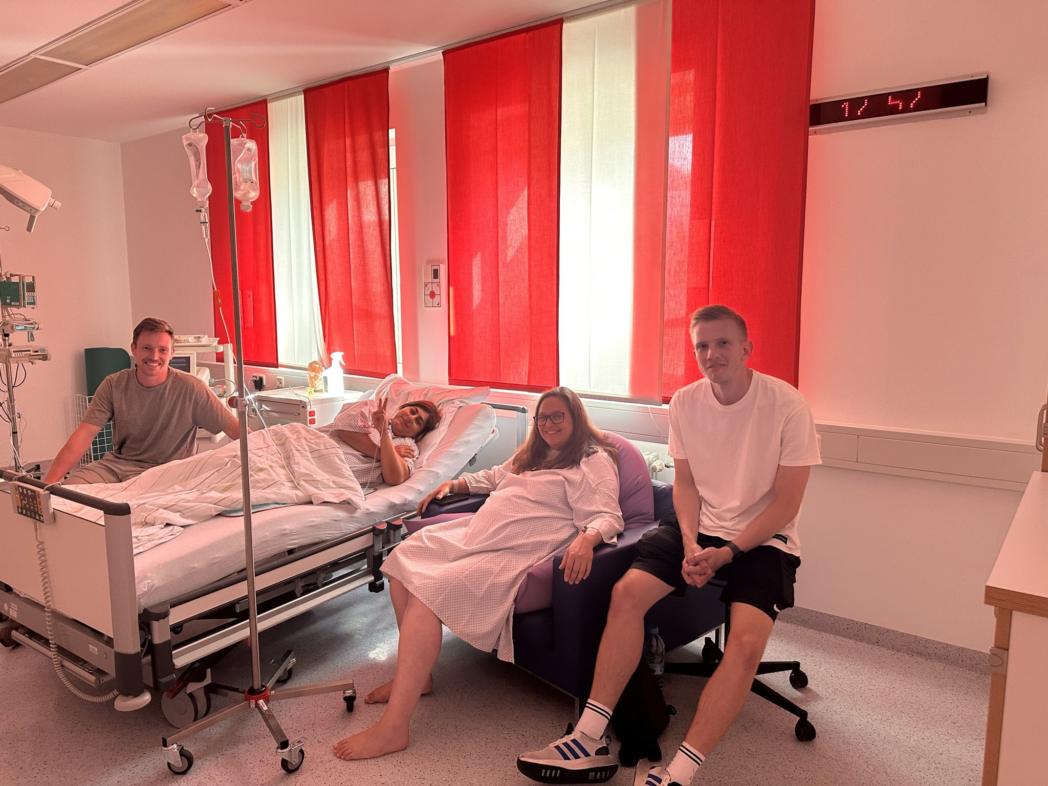 Auch als die Geburten näher rückten, blieben sie in enger Verbindung: Jede Frau hatte ihren eigenen Kreißsaal, ihren geschützten Raum. Aber in den ruhigeren Momenten davor schauten sie immer wieder bei der anderen Familie nebenan vorbei. Tina und Julius verbrachten sogar einige Stunden bei Cani und Patrick im Kreißsaal, als dort die Wehen stockten. „Das hat uns Kraft gegeben, wir haben uns gegenseitig immer und immer wieder Mut gemacht“, erzählt uns Tina.