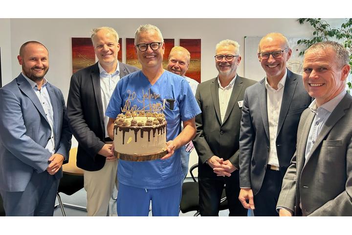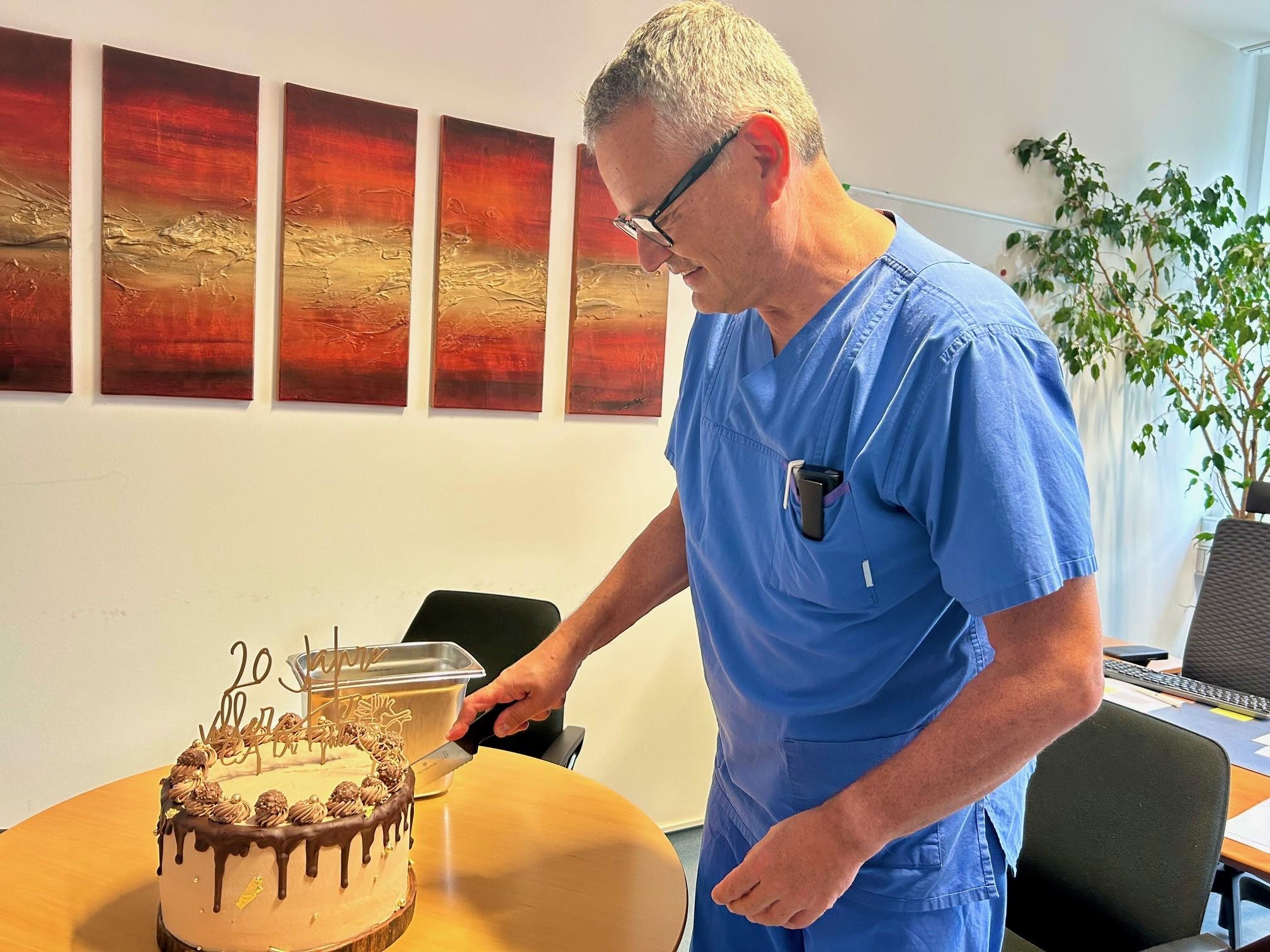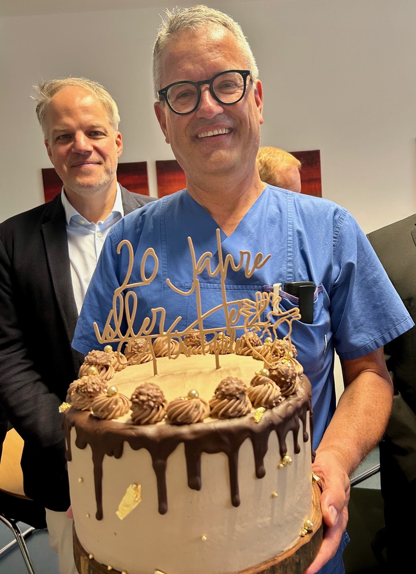 "20 Jahre voller Herz" – so steht es auf der Jubiläumstorte für Chefarzt Dr. Pohle