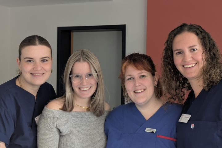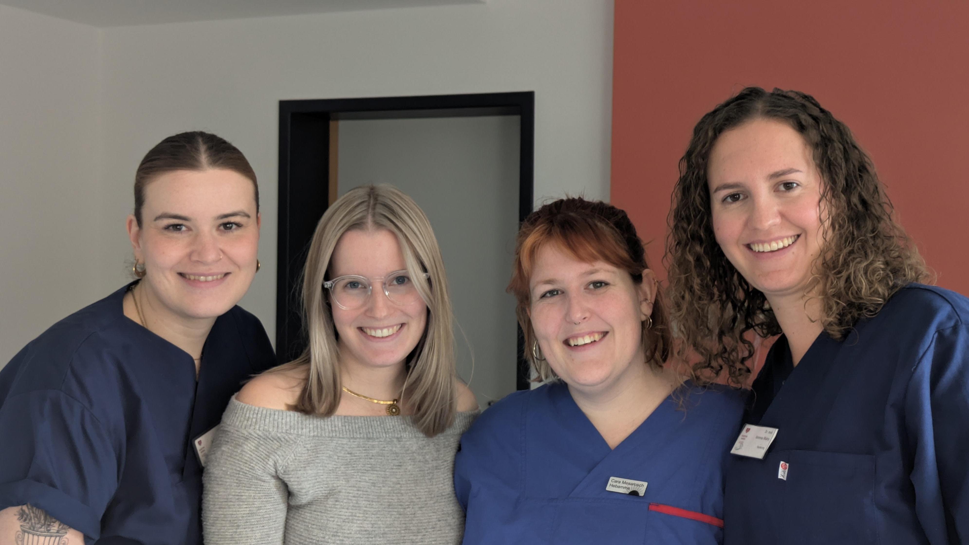 Ein Teil des Instateams der Geburtshilfe, von links: Dr. Julia Kauffels, Hebamme Theresa Rösler, Hebamme Cara Mesarosch und Dr. Vanessa Maley